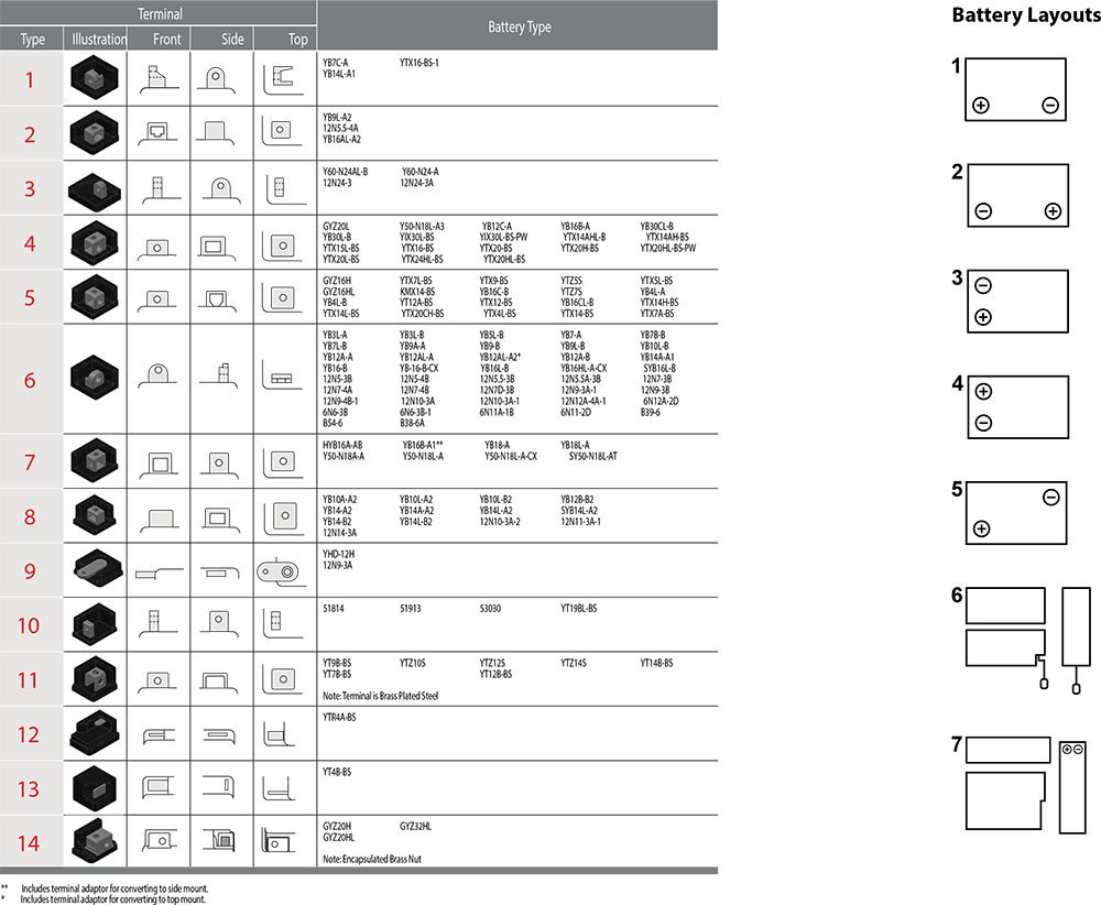 Las formas de los terminales varían de una batería a otra. Al identificar la batería de reemplazo correcta de la lista de este catálogo, se asegura de seleccionar el terminal adecuado.